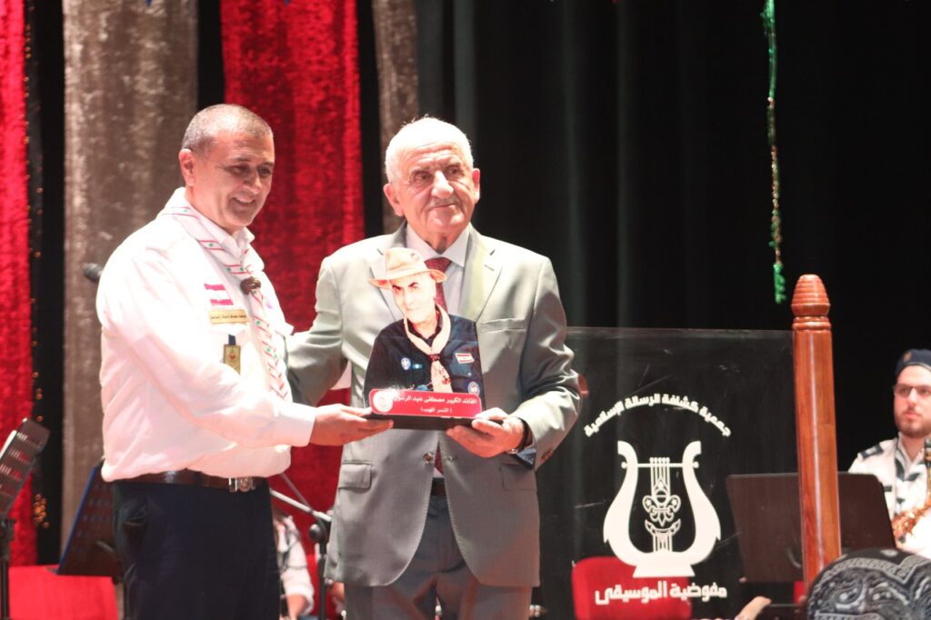 ثم كرم القائد عبيد فقيد الحركة الكشفية عامة وكشافة الجراح خاصة المرحوم مصطفى عبد الرسول بتقديم درع لعائلة الفقيد .