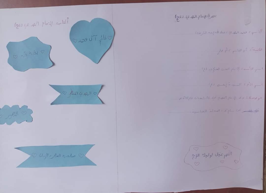 أقامت باقة الزّهرات في فوج الإمام الصّادق (ع) نشاطها الأسبوعيّ حيث تعرّفنّ على سيرة الإمام المهدي (عج) و ألقابه و من ثمّ فتح أوراق تضمّن بكل ما يوصينا به الإمام المهدي (عج) و اختتم النّشاط بدعاء الحجّة و توزيع الحلوى على الزّهرات.