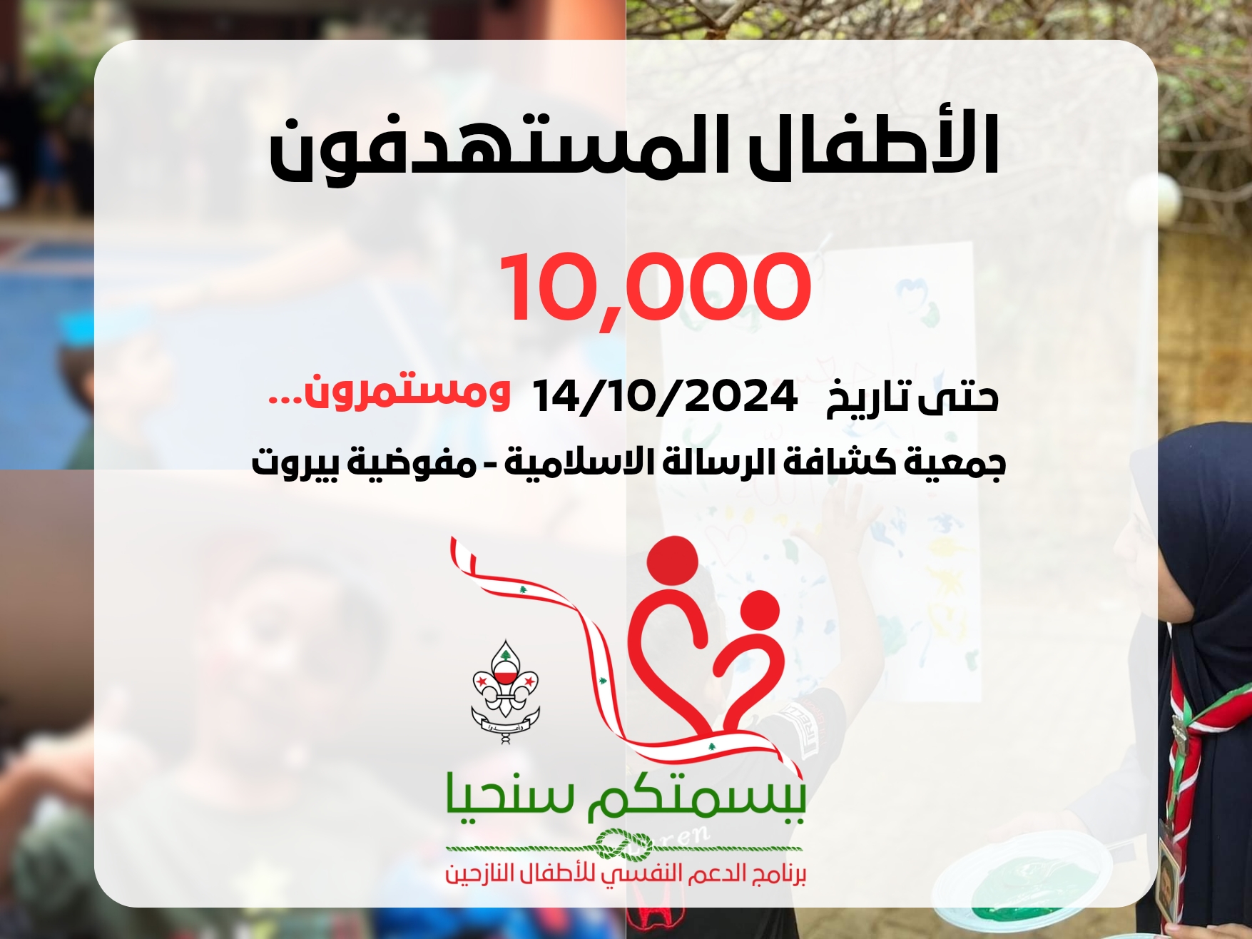 ضمن برنامج ببسمتكم سنحيا الذي اطلقته جمعيَّة كشَّافة الرِّسالة الإسلاميّة تستكمل مفوضيّة بيروت بفريق كشفي كبير ومُتخصص من القادة والقائدات أنشطتها الموجهة للأطفال في مختلف مراكز الإستضافة ضمن نطاق بيروت والذين بلغوا ما يُقارب 10٫000طفل حتى تاريخ اليوم 14/10/2024موزعين على المدارس والمعاهد والجامعات ومراكز الإيواء، من خلال تنفيذ أنشطة متنوعة وبرامج هادفة لبث روح الأمل والطمأنينة في صدور فلذات أكبادنا وتقليل التوتر والقلق وتقديم الدعم النفسي بشكل كامل.