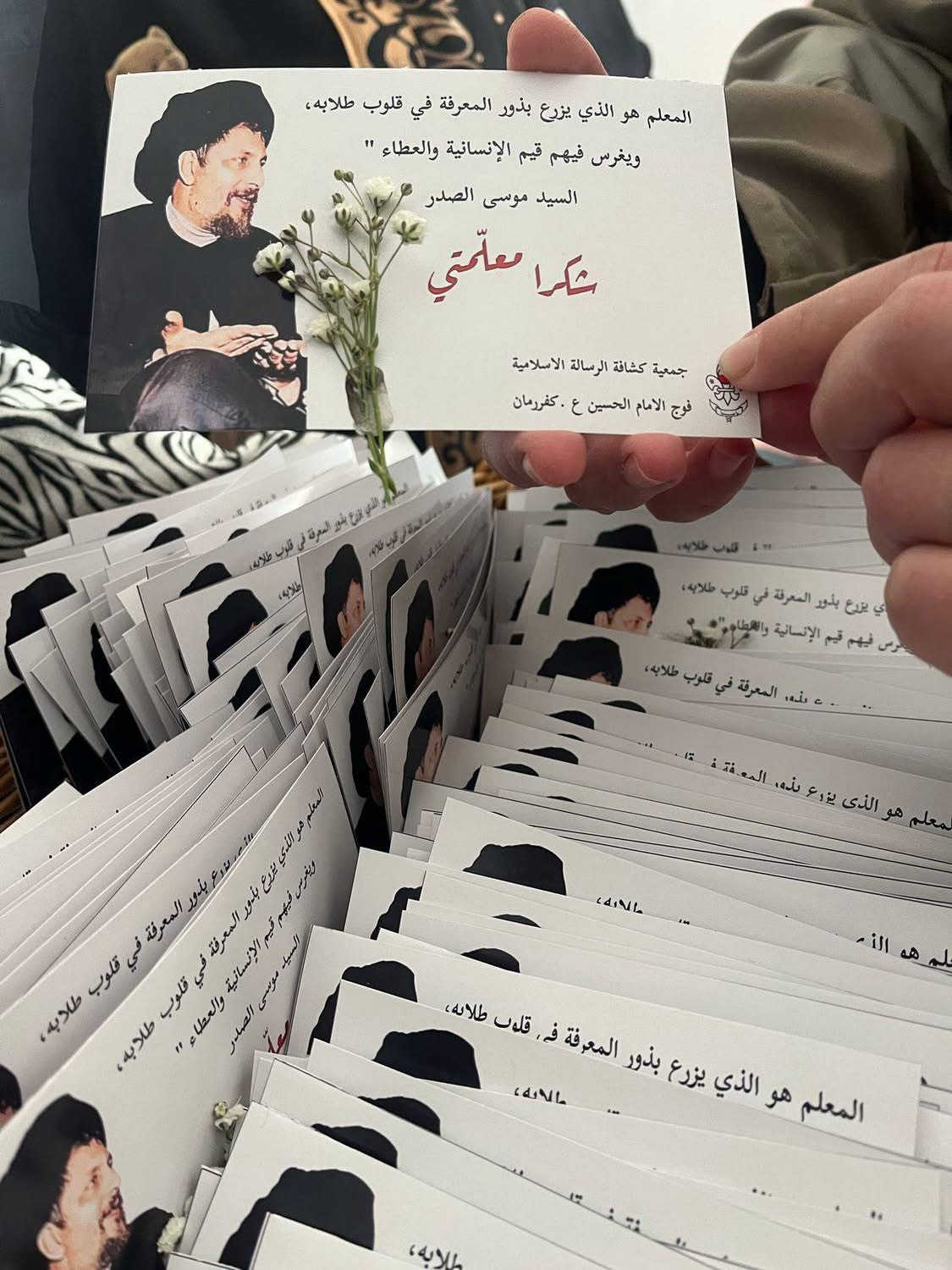 بمناسبة عيد المعلم، قامت جمعية كشافة الرسالة الإسلامية – مفوضية الجنوب – المنطقة الأولى – فوج الإمام الحسين(ع) – كفرمان بالتعاون مع قطاع شؤون المرأة، بزيارة المدارس في كفررمان وتكريم الأساتذة في هذا اليوم.