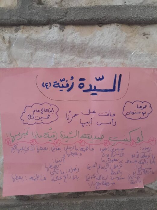 أحيت باقة براعم الأقحوان فوج أبي ذر الغفاري شقرا ، المنطقة السابعة في مفوضية جبل عامل ، يوم التاسع من محرم حيث افتتح المجلس بالتعرف إلى شخصية اليوم السيدة رقية ، و قصة استشهادها ثم قامت الباقة بفقرة لو كنت صديقة السيدة رقية ماذا أخبرها … بعد ذلك لونت الباقة و رسمت رموزا من عاشوراء و بعدها قمن بأنشطة تمثيلية عن حب الأخ استلهمنها من العباس و الحسين و زينب عليهم السلام و كل ما تعلمنه في الأيام الماضية ، كما مثلن قصة السيدة رقية التي تعلمنها اليوم