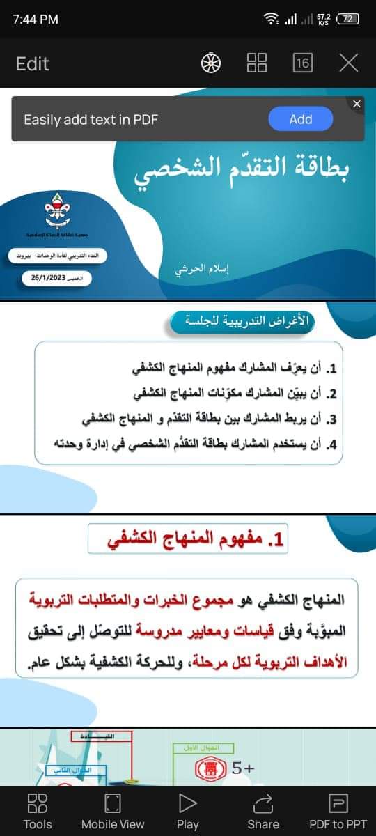 جلسة تدريبية بعنوان (بطاقة تقدم الأفراد وربطها بالمناهج الكشفية ) مع القائدة إسلام الحرشي رئيسة دائرة المناهج والبرامج في مفوضية تنمية القيادات المركزية