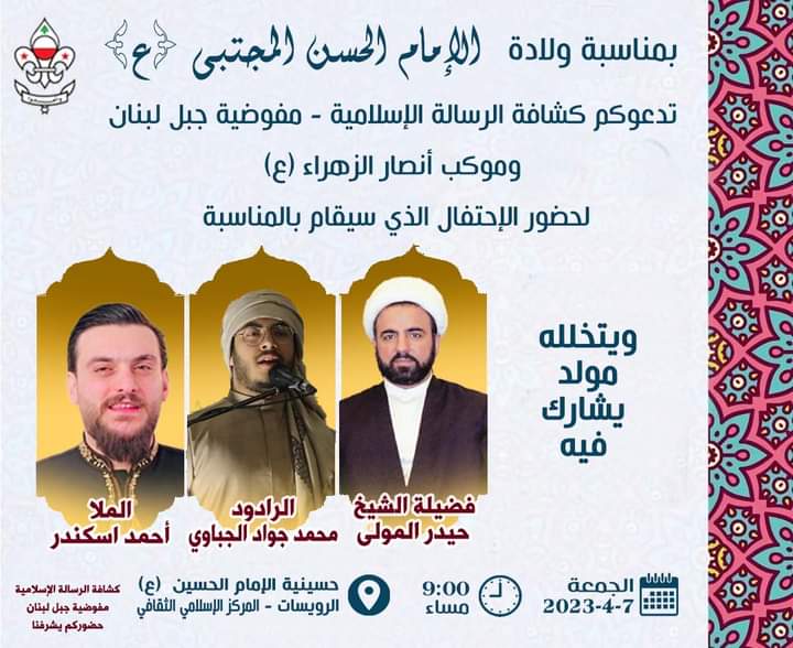 تدعوكم جمعية كشافة الرسالة الإسلامية مفوضية جبل لبنان وموكب أنصار الزهراء (ع) لحضور الإحتفال الذي تقيمه بمناسبة ولادة الإمام الحسن المجتبى (ع)