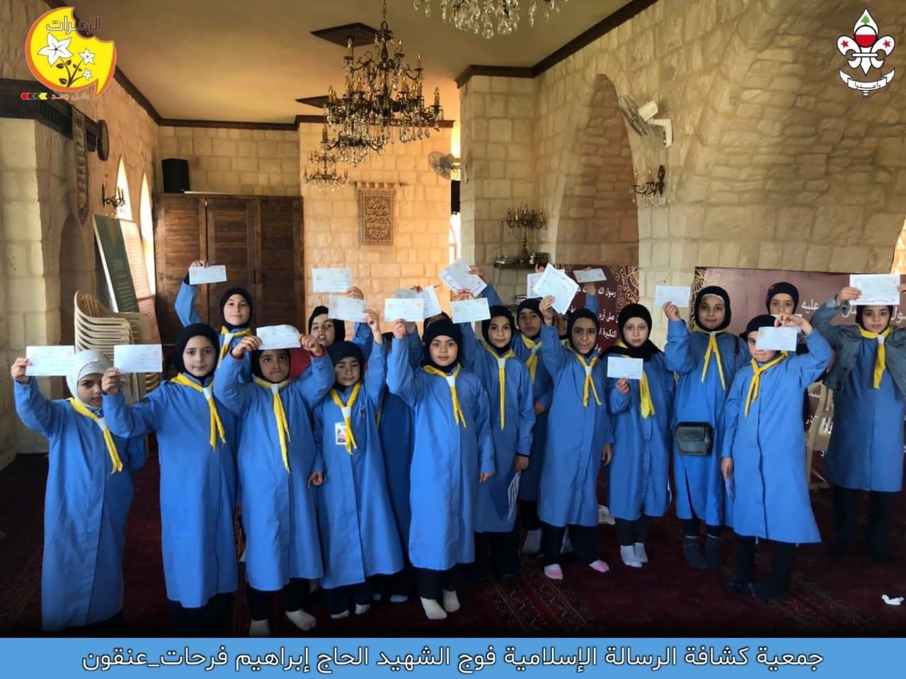 أقامت جمعيّة كشافة الرسالة الاسلامية- مفوضيّة الجنوب- المنطقة السّابعة- فوج الشهيد القائد الحاج ابراهيم فرحات- عنقون، النشاط الثاني لباقة الزهرات ضمن سلسلة أنشطة “أريج الرحمن “، وتخلّلت النشاط عدّة فقرات تضمنّت التّعرّف على هوية الامام الحسن (ع) وعدد من كراماته من خلال السرد القصصي، التعرّف على القرآن الكريم وعدد أجزائه وسوره وصفحاته وخصائص سوره وقصصه، وتوزيع بطاقات تميّز على الزهرات المتميزات في تنفيذ مطالب الاسبوع الاول من شهر رمضان المُبارك.