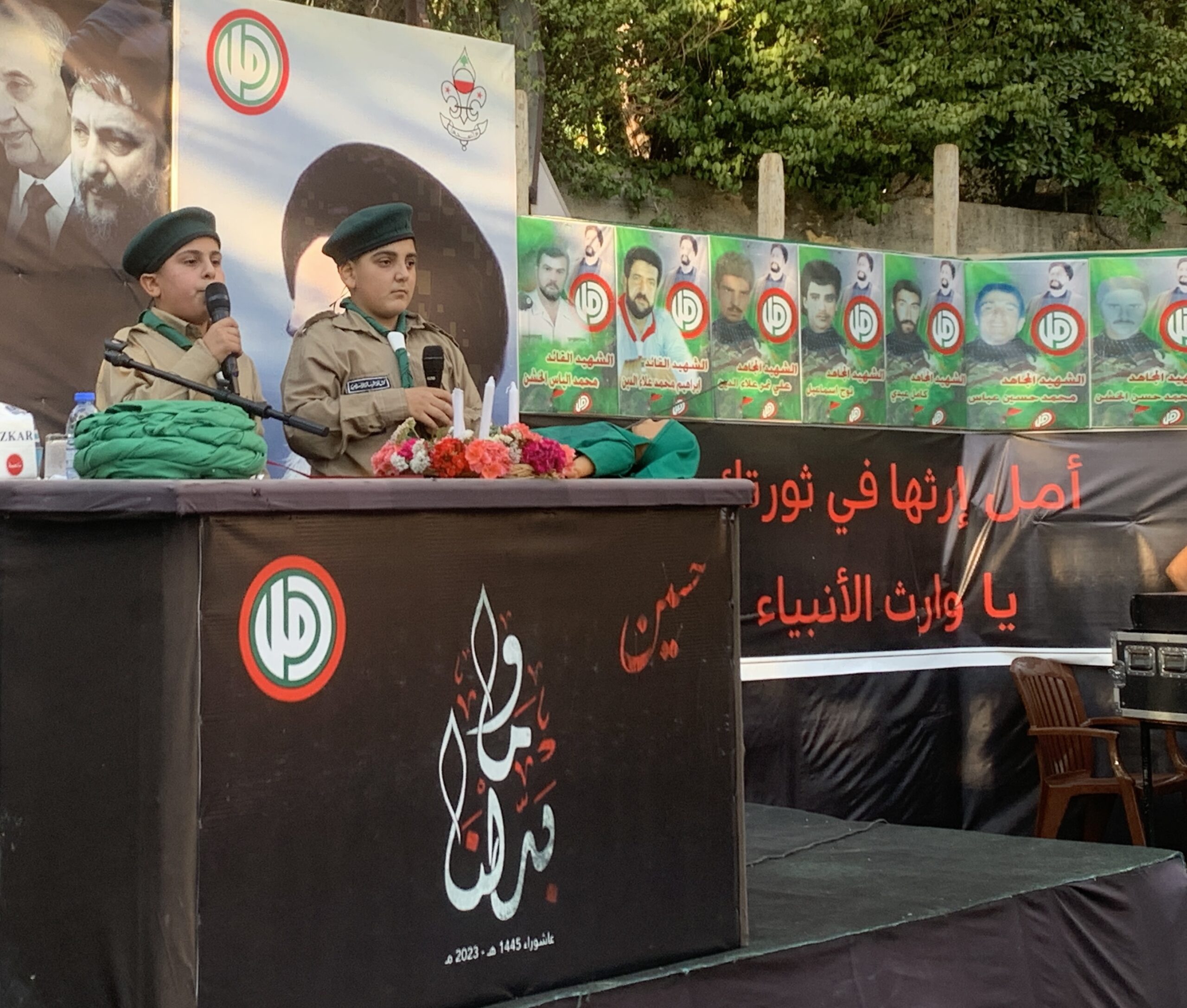 الكشفي علي يحيى موسى والكشفي حسين أحمد وهبي من فوج الإمام الصدر – سحمر – المنطقة الثامنة يلقيان خطبة الإمام زين العابدين (ع) في المجلس العاشورائي الذي تنظمه شعبة سحمر.